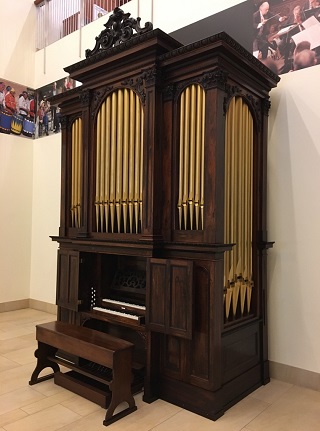 We are pleased to announce that, after fifty years of homelessness, the only surviving work of New York organ builder Thomas Robjohn has finally found a home. It is now on permanent display at the Musical Instrument Museum in Phoenix, Arizona. The 1859 instrument is fully playable, and its gorgeous walnut case, entirely veneered in rosewood, suits it well to this venue where it is prominently displayed and occasionally played. See specs and more photos on the Opus 37 page.