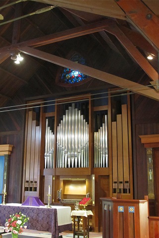 This organ is a rebuild of Opus 23, including the following additions and changes: attached key desk with shutters, electric stop action with multi-level combination action, Bluetooth page turning, swell enclosure, and lower pedal towers, displaying wooden Subbass pipes in place of the largest tin pipes.